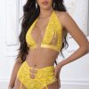 Head over heels for this Venetian laced high waist garter panty with curving framing straps and tempting keyholes embellish with rhinestone detail. Matching halter top plays sexy with a perfect keyhole and dimant? details. Includes stockings.