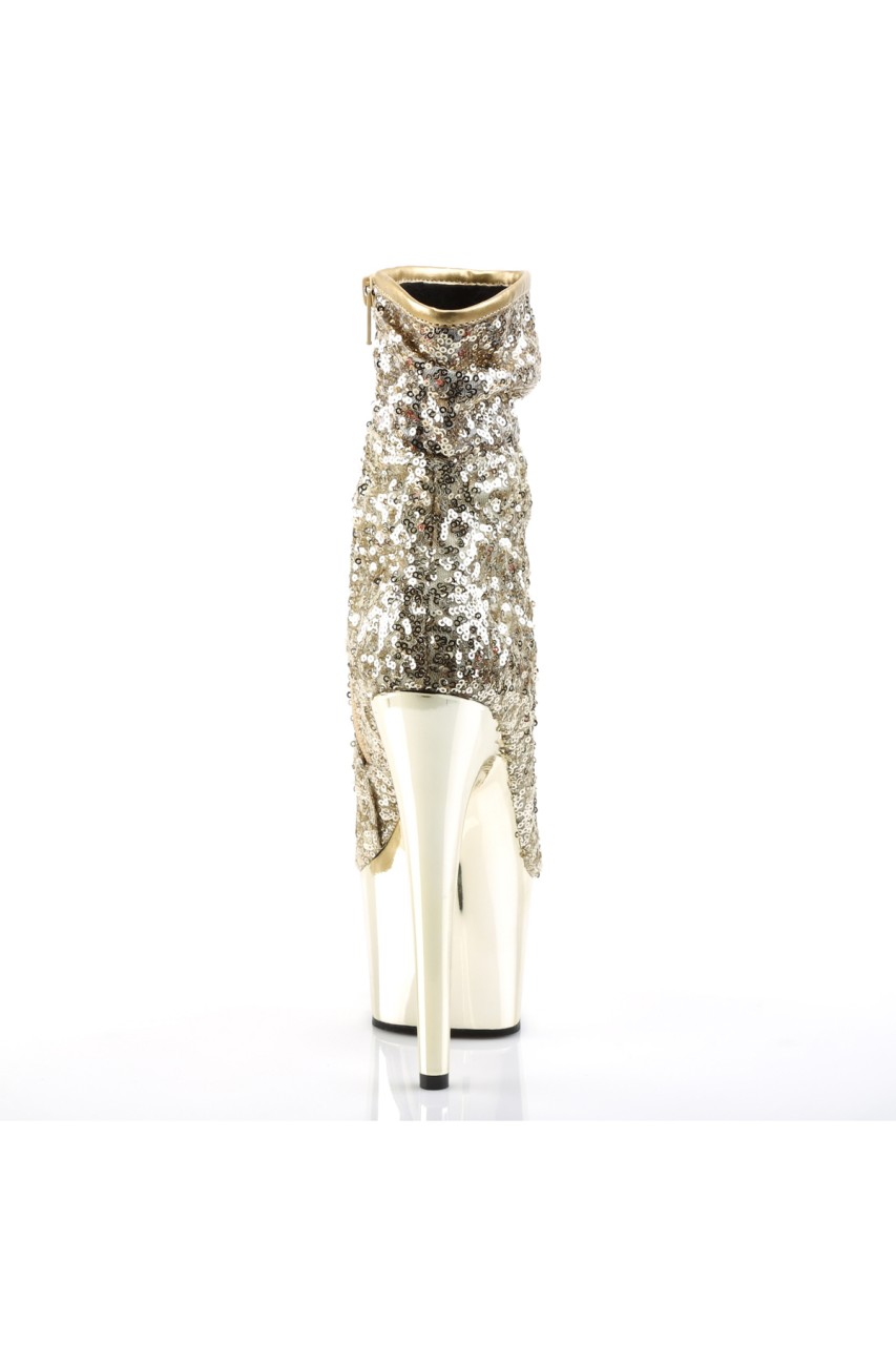 7″” (17.8cm) Stiletto Heel, 2 3/4″” (7cm) Chrome Plated Platform Peep Toe Ruched Shaft Ankle Boot, Inner Side Zip Closure