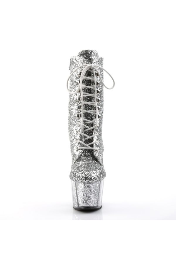 7″” (17.8cm) Stiletto Heel, 2 3/4″” (7cm) Glitter-filled Platform Front Lace-Up Ankle Boot, Inner Side Zip Closure
