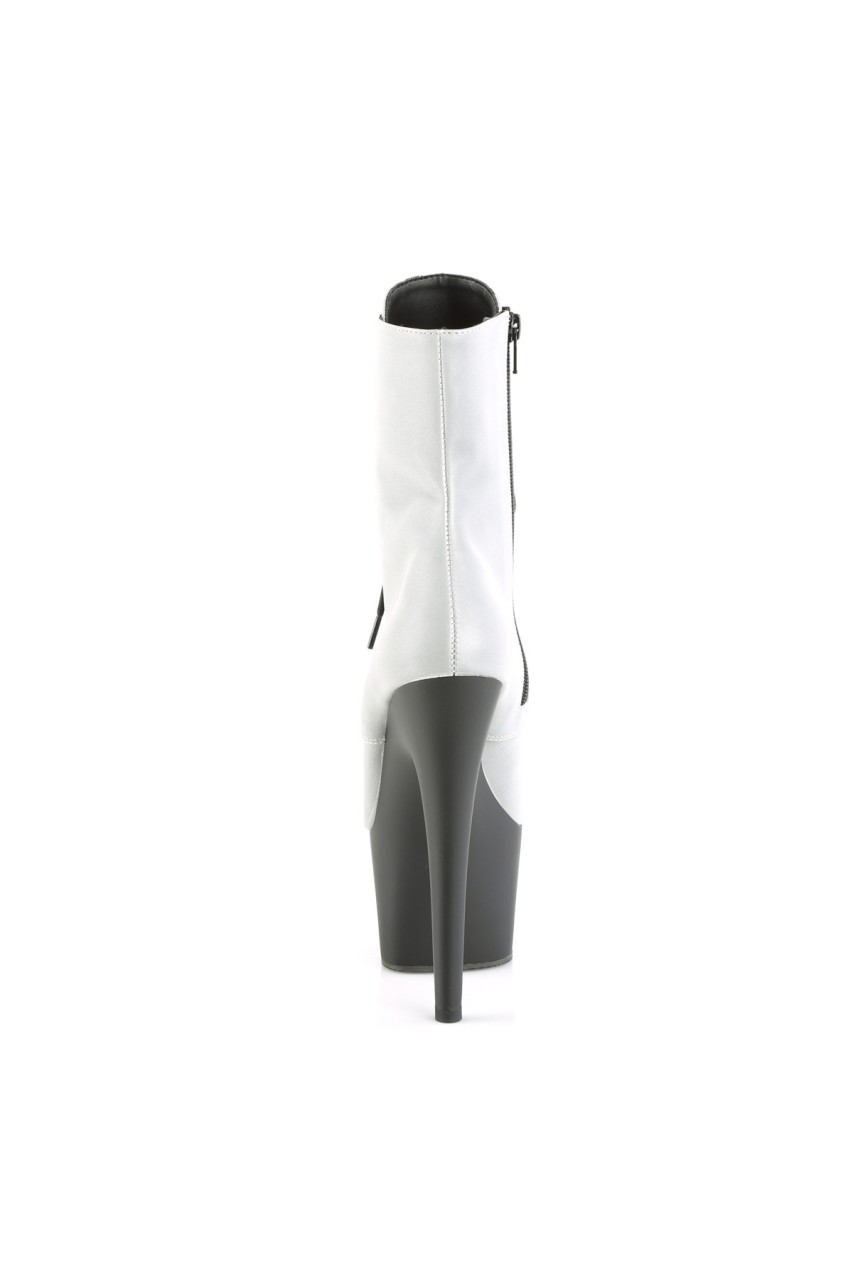 7″” (178mm) Heel, 2 3/4″” (70mm) Platform Lace-Up Front Ankle Boot w/Reflective Effect Upper, Inner Side Zip Closure