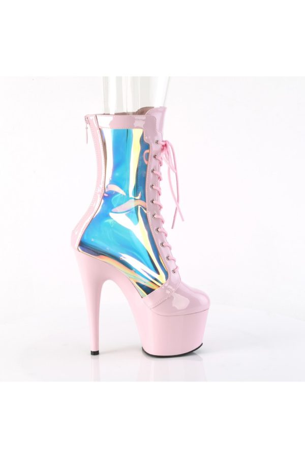 7″” (178mm) Heel, 2 3/4″” (70mm) Platform Lace-Up Front Mid Calf Boot Featuring Holographic Side Panels, Back Zip Closure