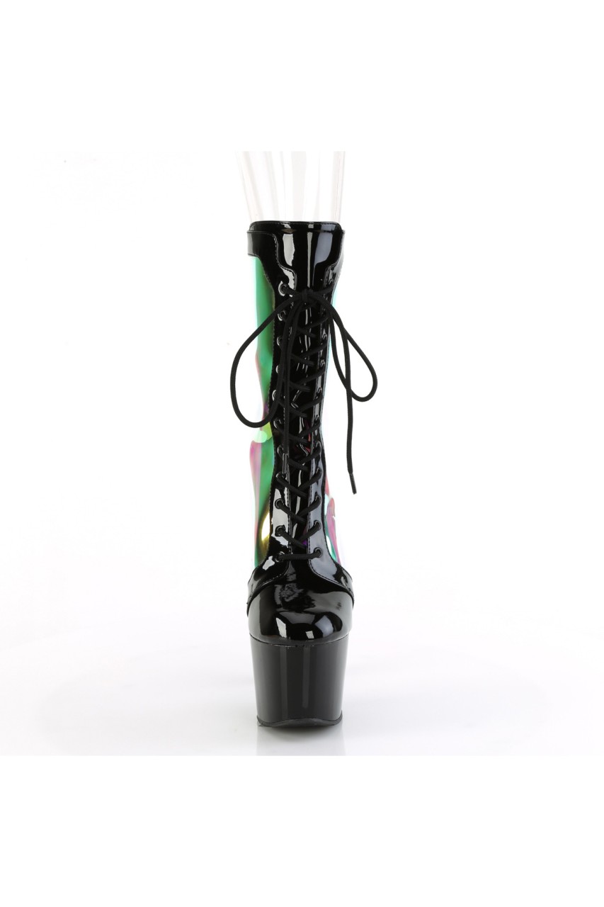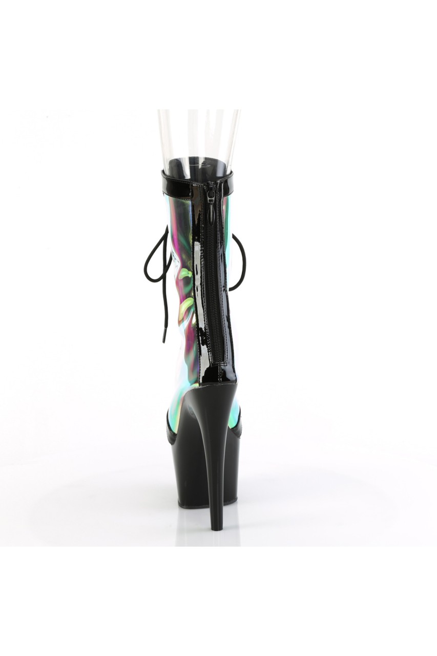 7″” (178mm) Heel, 2 3/4″” (70mm) Platform Lace-Up Front Ankle Boot Featuring Holographic Side Panels, Back Zip Closure