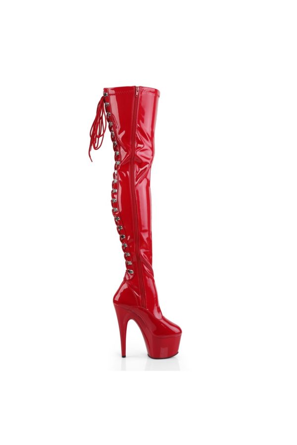 7″” (17.8cm) Stiletto Heel, 2 3/4″” (7cm) Platform Back Lace-Up Stretch Thigh High Boot, Full Side Zip Closure