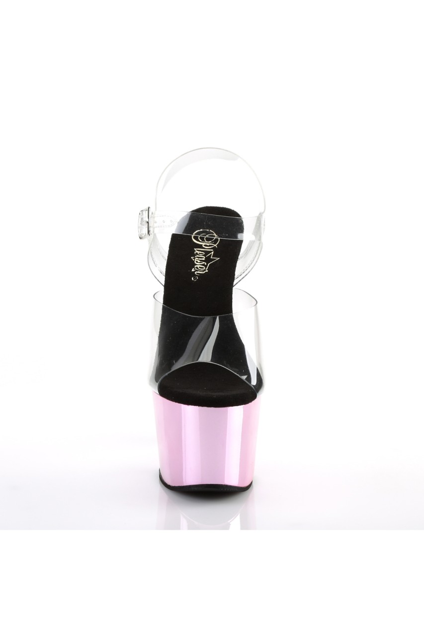 7″” (178mm) Heel, 2 3/4″” (70mm) Platform Ankle Strap Sandal w/ Chrome Plated Bottom