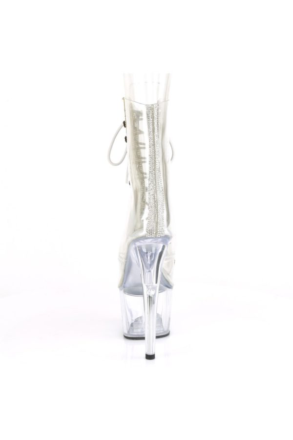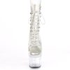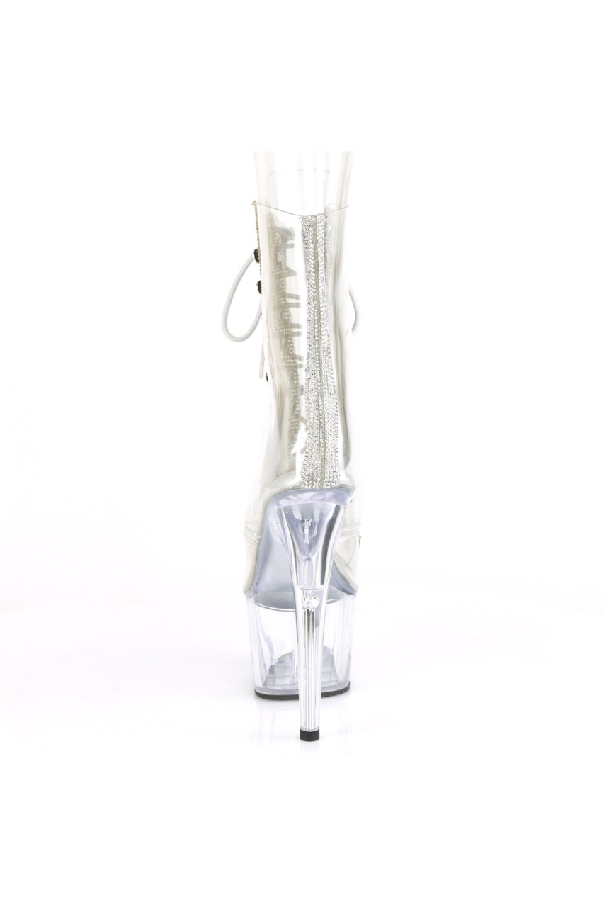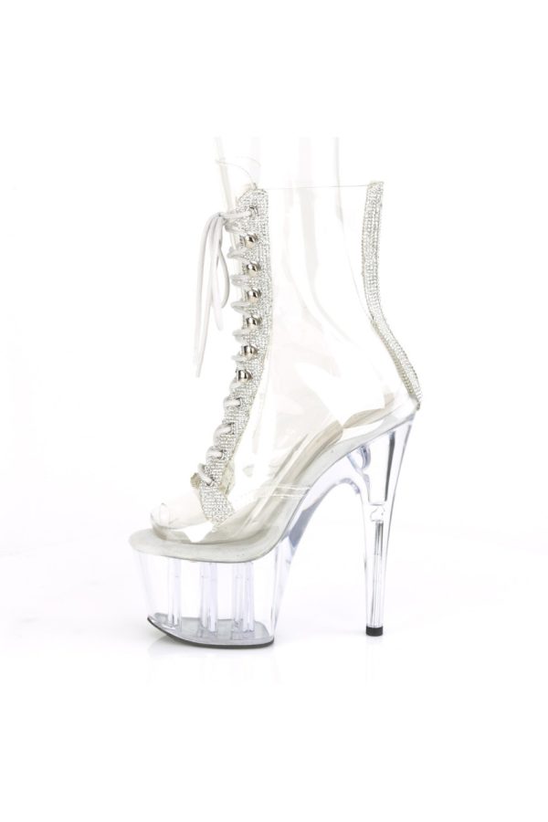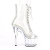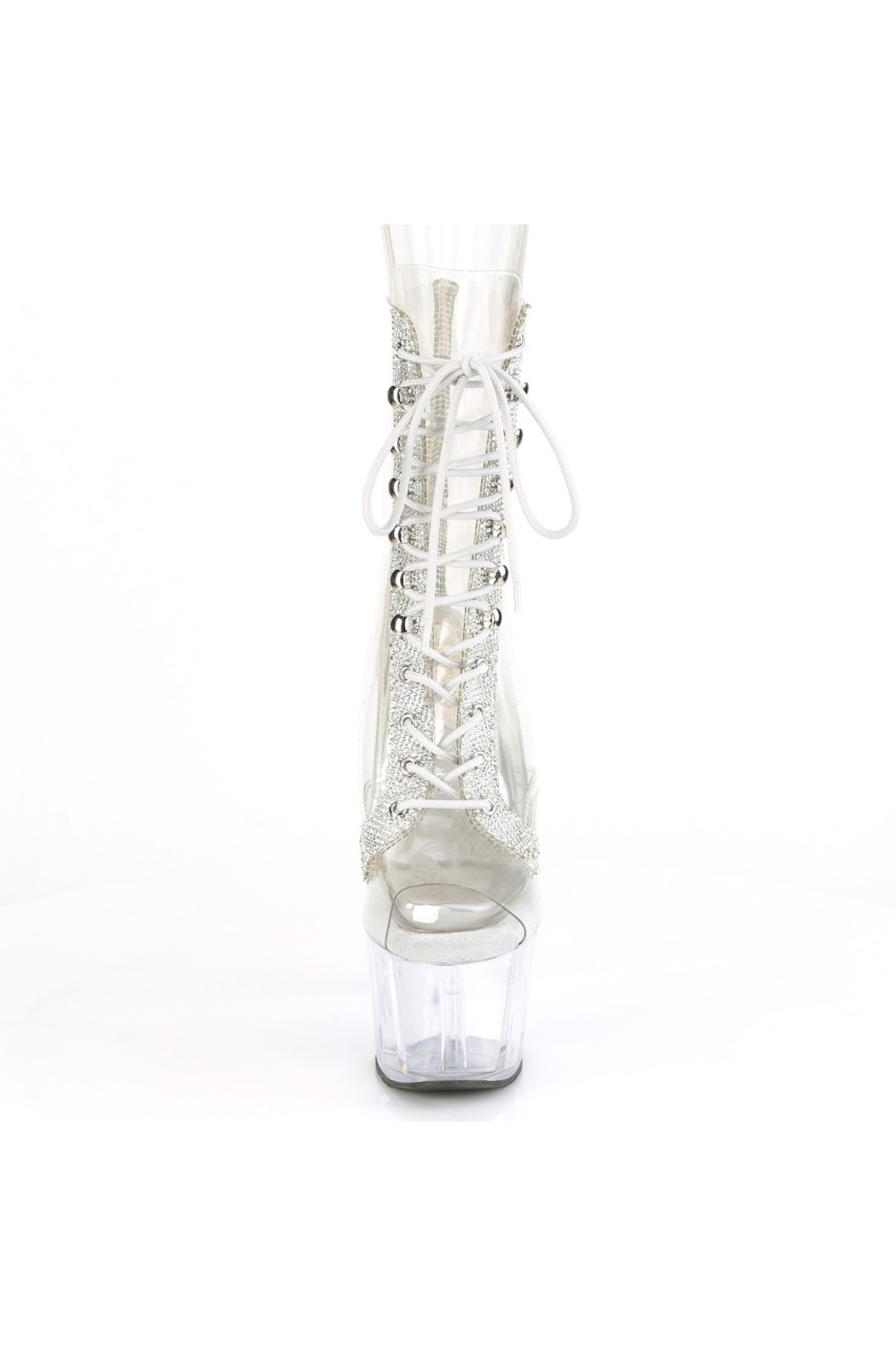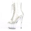 7″” (178mm) Heel, 2 3/4″” (70mm) Platform Peep Toe Lace-Up Front Ankle Boot w/Rhinestone Embellishment Along Front Panels & Back