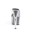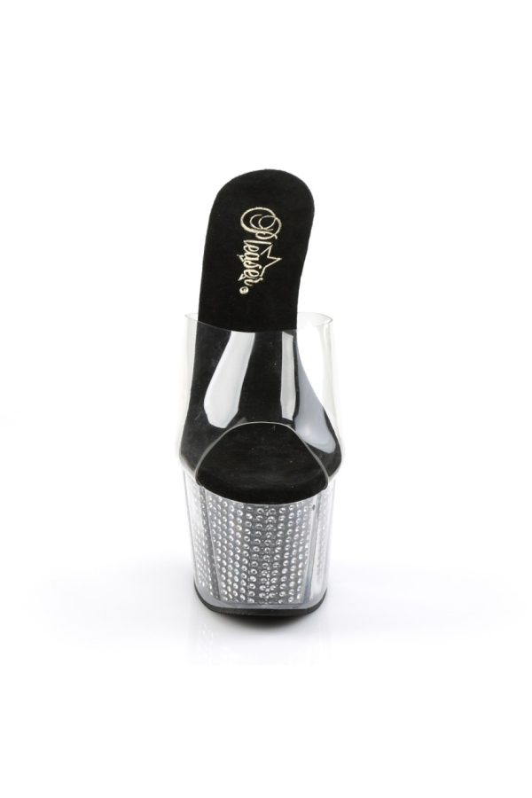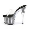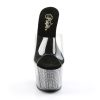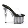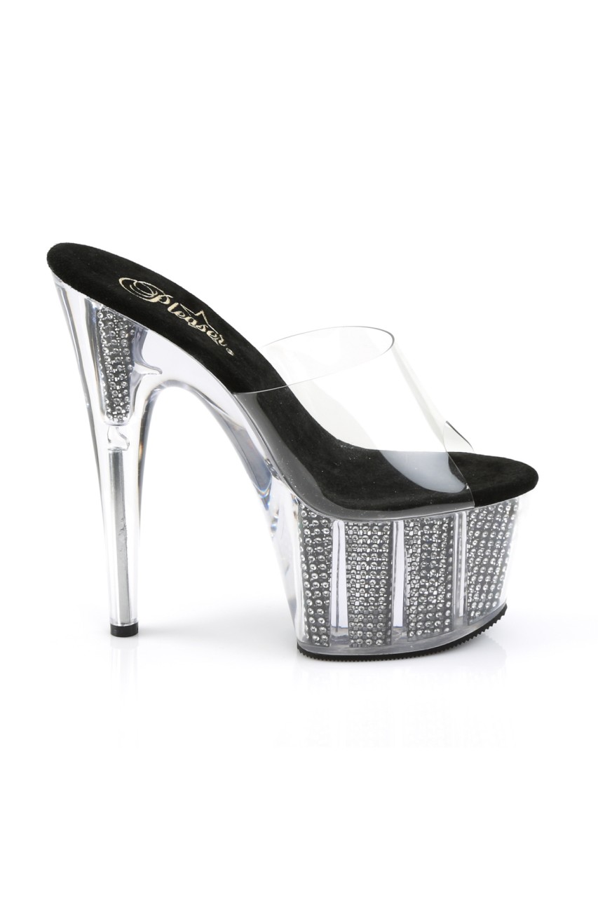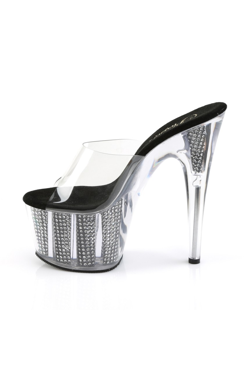 7″” (17.8cm) Stiletto Heel, 2 3/4″” (7cm) Platform Slide Featuring Chrome Plated, Simulated Rhinestone Filled Bottom