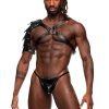 From the Leather collection by Male Power, this style includes a criss crossing chest harness with a gladiator inspired, bendable shoulder shield, fully adjustable buckled straps, metal rings and studs. Soft Nubuck Leather with Polyurethane coating, heavy metal rings, buckles, and studding. Do Not Wash, Do Not Bleach, Do Not Tumble Dry