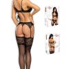 Marilyn is an exclusive and extremely sexy 3 piece set made from elastic glossy material and beautiful lace. Included is an open cup bra which is partially stiffened by cushioning on the cup the bra is also underwired and across the breast sits a lace trim. The lace trim has a vertical line of material which helps to line the trim across the breasts. The under bust and back of the bra is decorated with glossy material and the bra is fastened with an adjustable hook and eye feature. Also at the back of the bra is the same lace which is sewn into the bottom of the straps. Shoulder straps are thin and adjustable. Within the set is a suspender belt which is decorated with gorgeous lace trim and glossy material. There is stiffened boning at the front of the suspender belt and also where the suspender straps are located. The suspender straps are adjustable and have a rubber clasp. The glossy material sits at the sides of the suspender belt and the suspender belt is fastened at the back with an adjustable hook and eye feature. Lastly a matching thong is included which has some delightful detailing. At the front of the thong is a panel with glossy material edged with lace trim. Above sits a small hoop which has two elasticated straps that follow their way round to the back. The back of the thong has a small lace trim panel at the top. Cotton gusset inside. Item comes packaged in a Beauty Night box with a picture presenting the product which is marked with a hologram from the logo Beauty Night Fashion and also has a lovely light grey design printed on it. Complete with organza drawstring pouch for storage or laundry included.