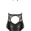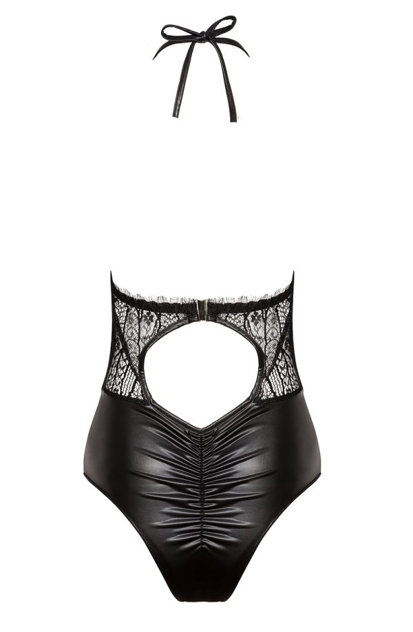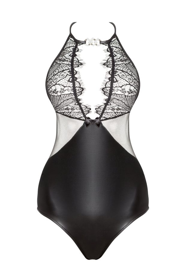 Elegant body made from soft, stretch wet-look fabric and adorned with beautiful lace. The impressively crafted upper part wonderfully highlights the neckline and is further embellished with a sparkly buckle. A fabulous halter neck design, Delilah Teddy is presented in elegant packaging featuring a picture of the product and marked with the Beauty Night Fashion logo hologram. Includes a bag-pouch for storage or laundry.