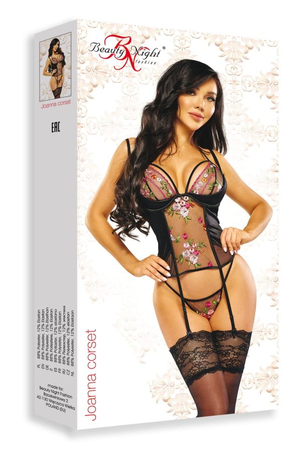 A beautiful two piece corset set. The stunning Joanna corset is made in black with intricate flower embroidery detail. Adjustable straps at the back allow for an individual fit along with adjustable suspender straps. The matching thong is included along with a lovely Beauty Night box. Please note the stockings are not included but are available separately.