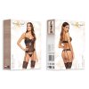A stunning corset made from delicate lace and semi-transparent mesh. It features garter straps, a hook closure, and adjustable straps for a perfect fit. The underwire cups, adorned with black lace and copper accents, beautifully highlight the neckline. The matching thong also showcases the same elegant lace. Packaged elegantly with a photo that showcases the product.  Please note the stockings are not included but are available separately.