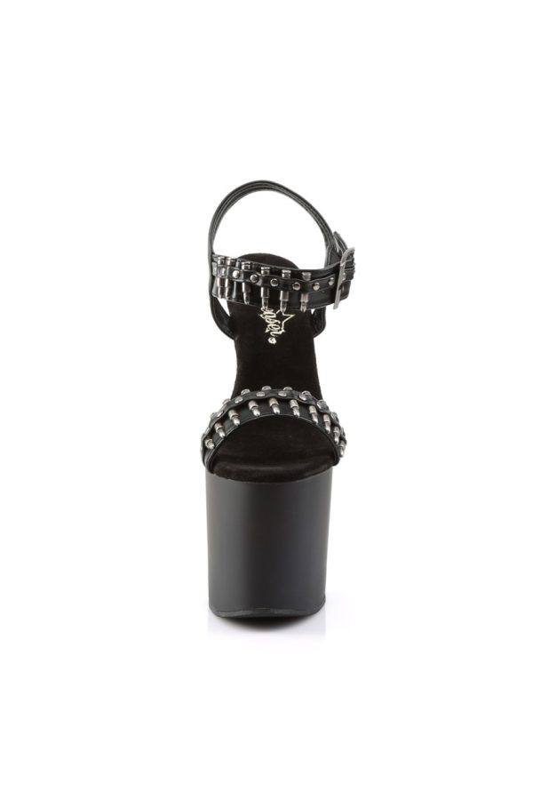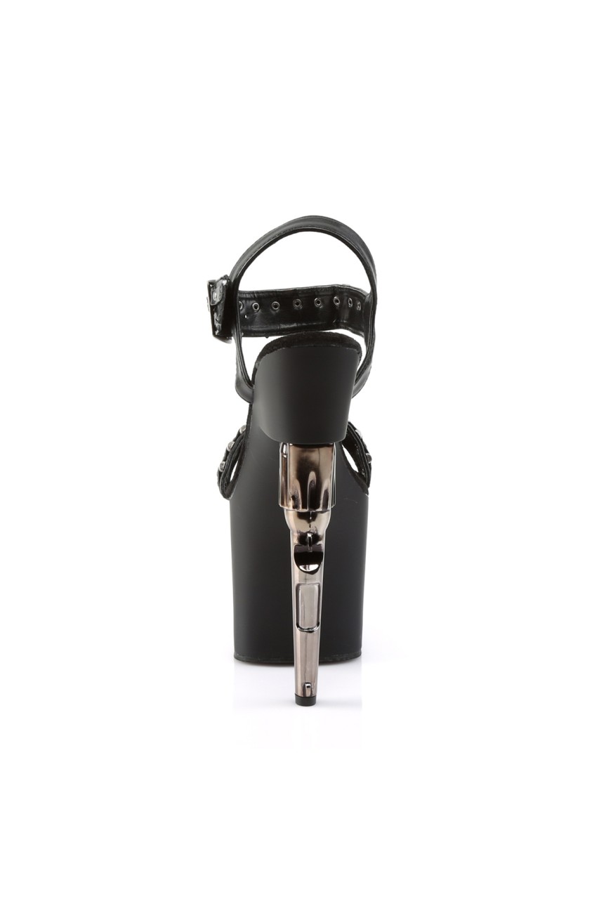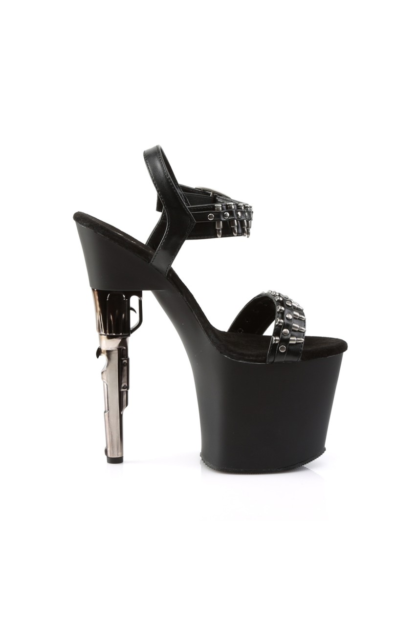 7 1/2″” (19cm) Gun Heel 3 1/2″” (8.9cm) Platform Ankle Strap Platform Sandal with Bullet Strap