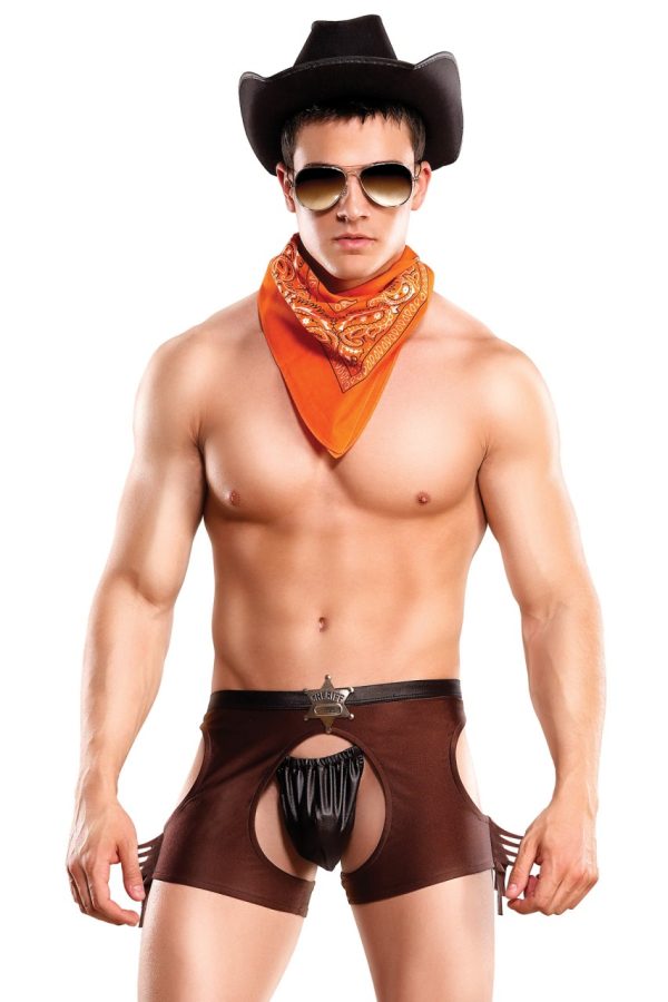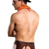 Cocky Cowboy includes bandanna, clip on badge, short chaps with cire waistband and posing strap with comfort fit pouch, elastic waistband and g-string back.