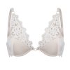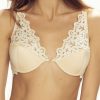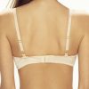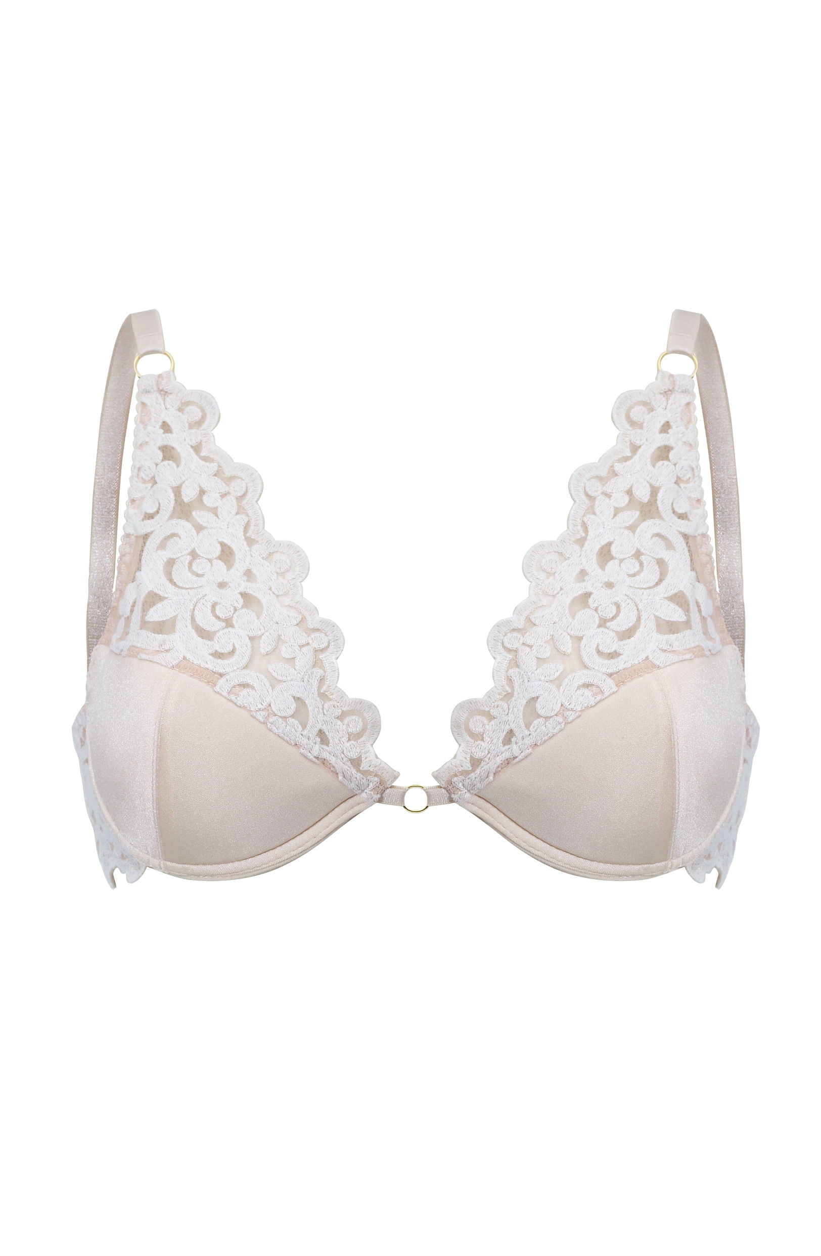 Delicate underwired bra with lightly padded cup to provide shape and support. Adjustable straps with gold coloured metal fittings. Lovely lace and centre ring detail. Hook and eye fastener at the back with three adjustment positions.