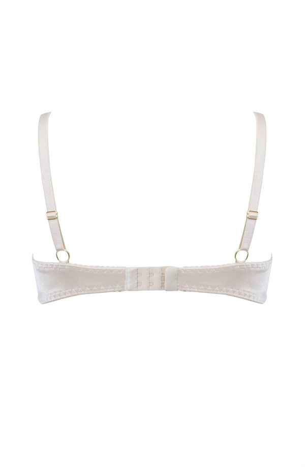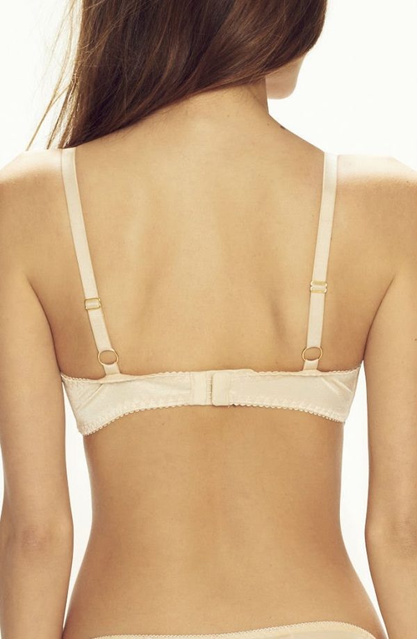 Lovely lace cup underwired bra with over cup strap decoration detail. Fully adjustable straps with solid gold colour metal fittings. Hook and eye fastener at the back with three adjustment positions.