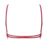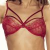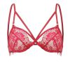 Delicate lace underwired bra crafted from fine botanical French eyelash lace. Three sectional cup with underwiring support. Decorative strappy detailing at the front with a gossamer back. Lovely adjustable straps with gold coloured metal fittings and adjustable fastener with three position. Finished with sensational slinky scalloped edges – hot!
