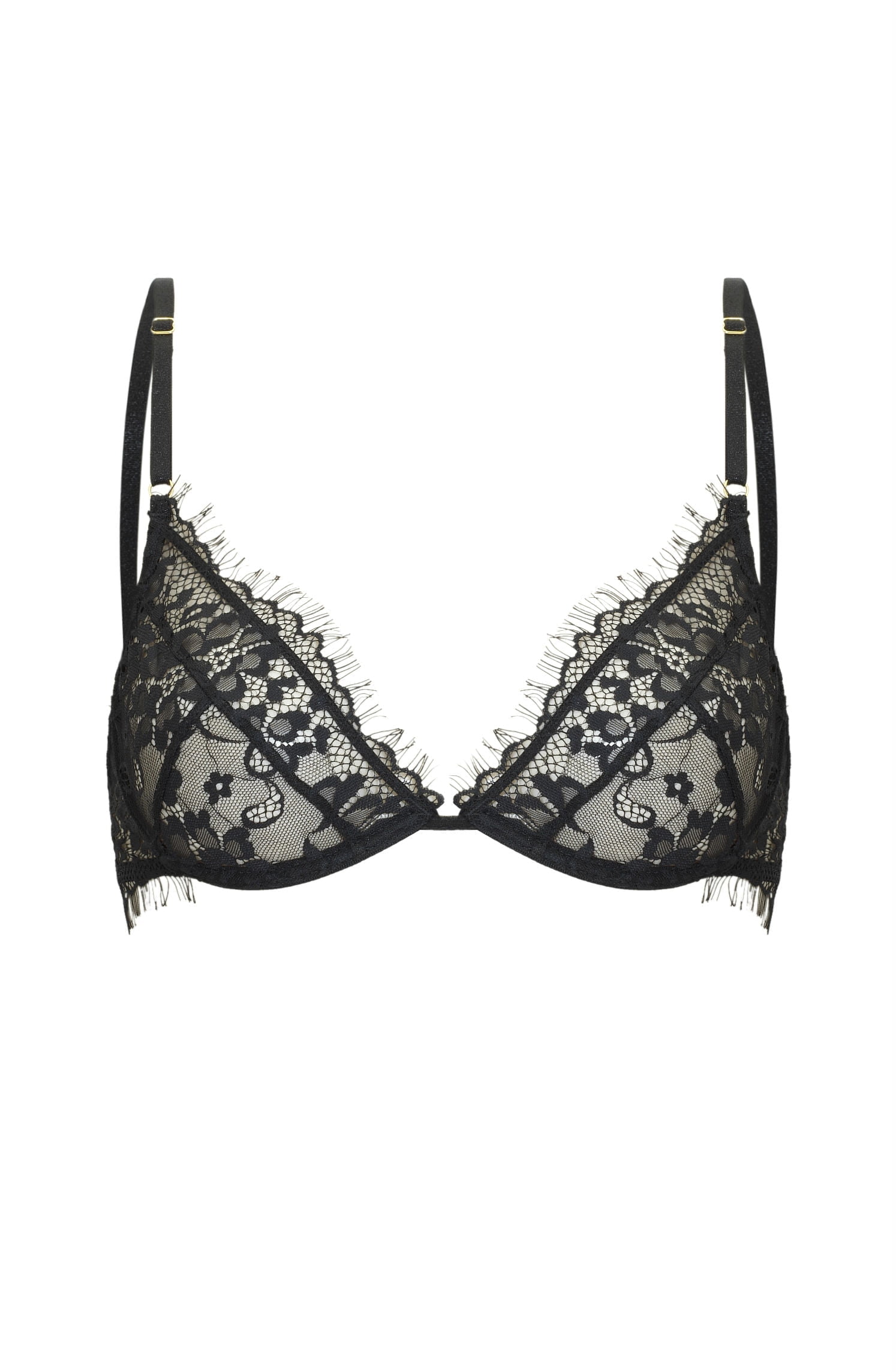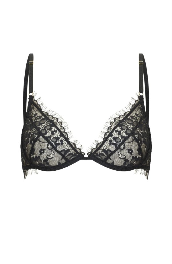 Delicate lace underwired bra decorated with eyelash lace. Three sectional cup to provide comfort and support. Lovely adjustable straps with gold coloured metal fittings and adjustable fastener with three position. Gorgeous!