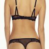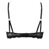 Super sexy black bra with mesh overlay on lower cup and co-ordinating lace. Thin strap over cup detail and lace under band. Delicate straps with gold metal fittings and V shape strap detail at the back. Three hook and eye postions for comfort and fit.