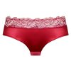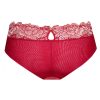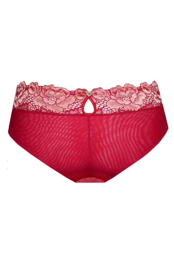 Lined satin front hipster for light tummy smoothing, mesh back for no panty lines, two toned stretch lace and features a satin trimmed keyhole with a metal button on the back
