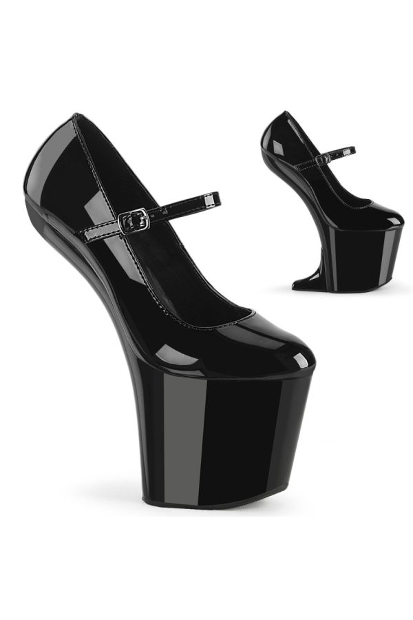 8″” (200mm) Heelless, 3″” (76mm) Platform Mary Jane Pump. Can be Transformed into a Mini Wedge Sandal with the Included Heel