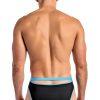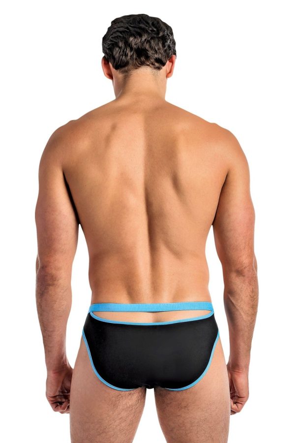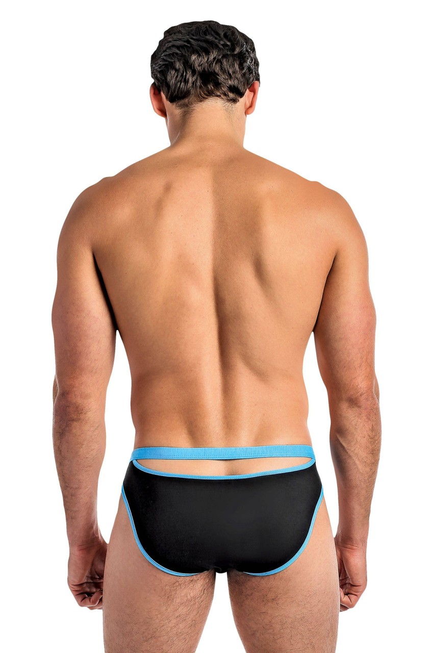 Lo rise bikini, cutout windows on front and back, contrasting colored trim. Full back coverage