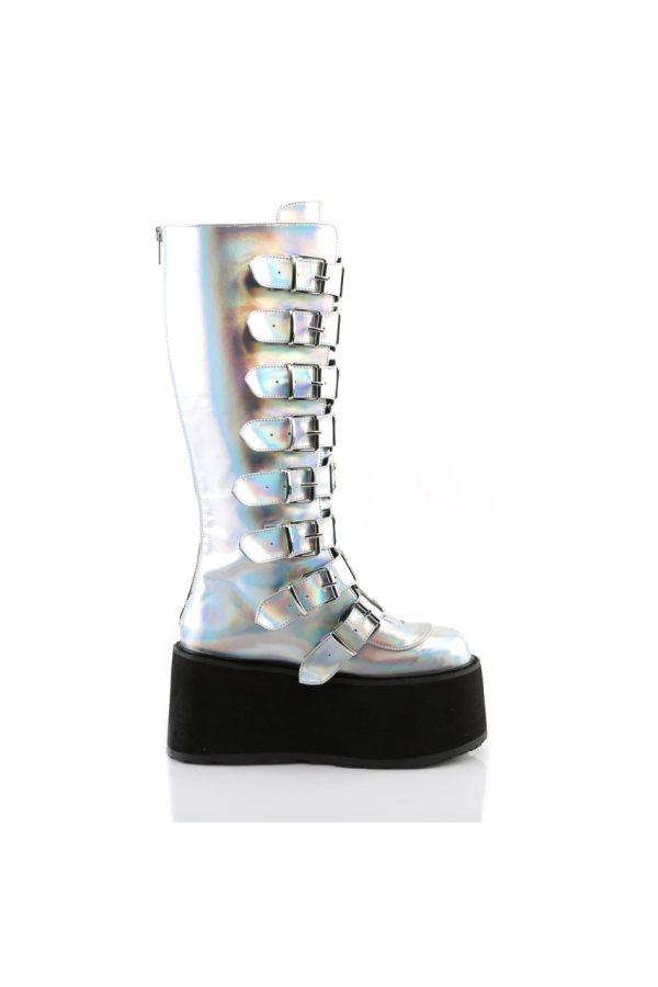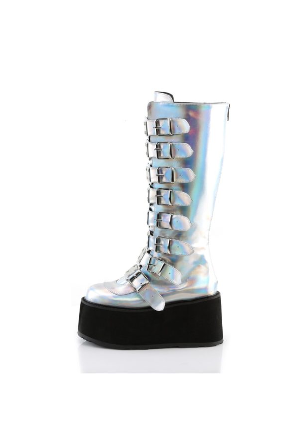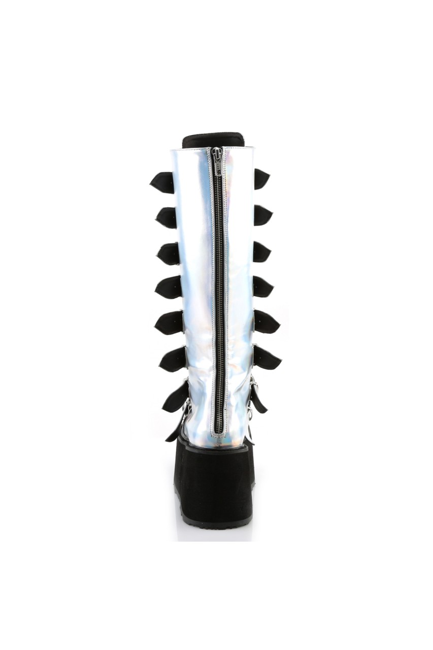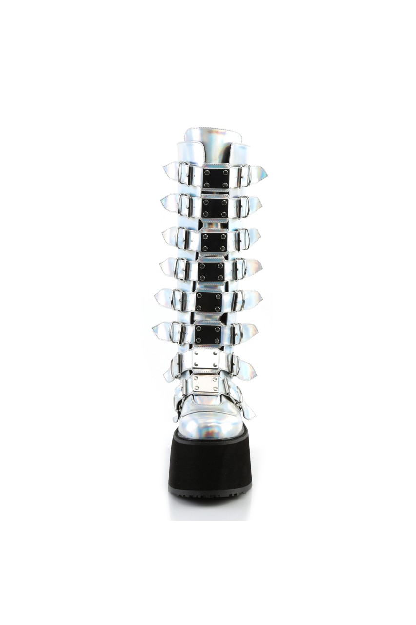 3 1/2″” (90mm) Platform Knee High Boot Featuring 8 Buckle Straps w/ Metal Plates at Center, Back Metal Zip Closure