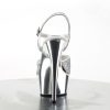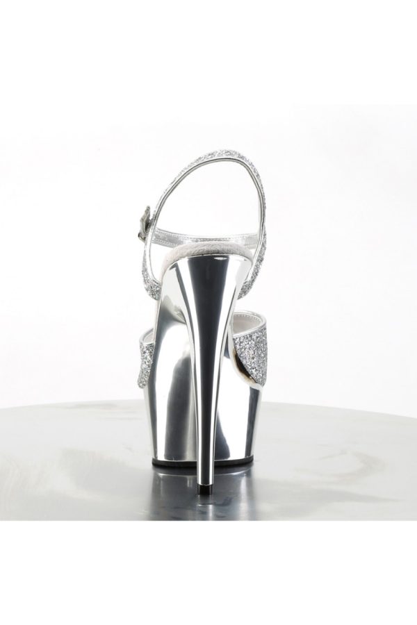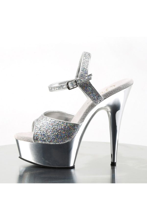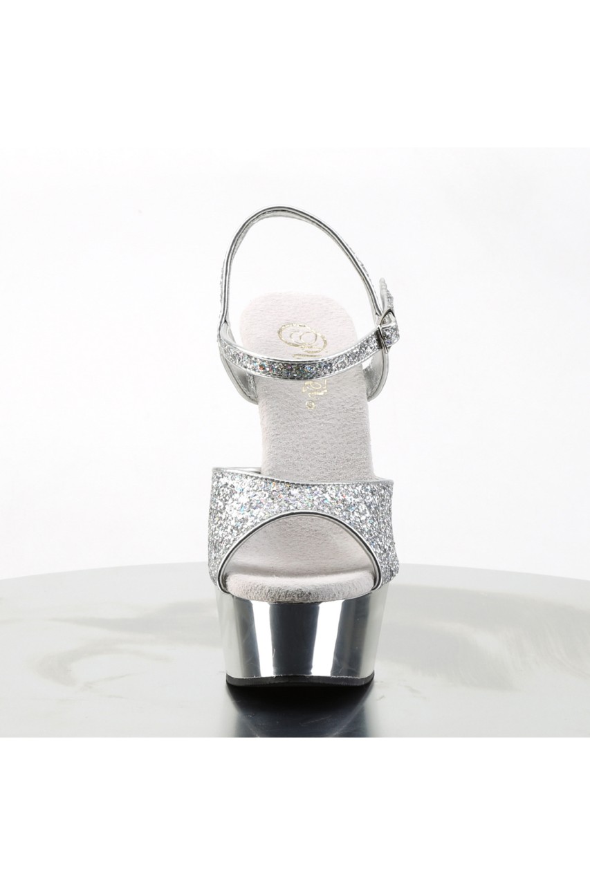 6″” (15.2cm) Stiletto Heel, 1 3/4″” (4.5cm) Chrome Plated Platform Peep Toe Ankle Strap Sandal Featuring Glittered Upper