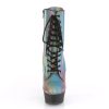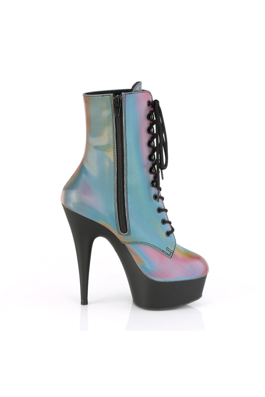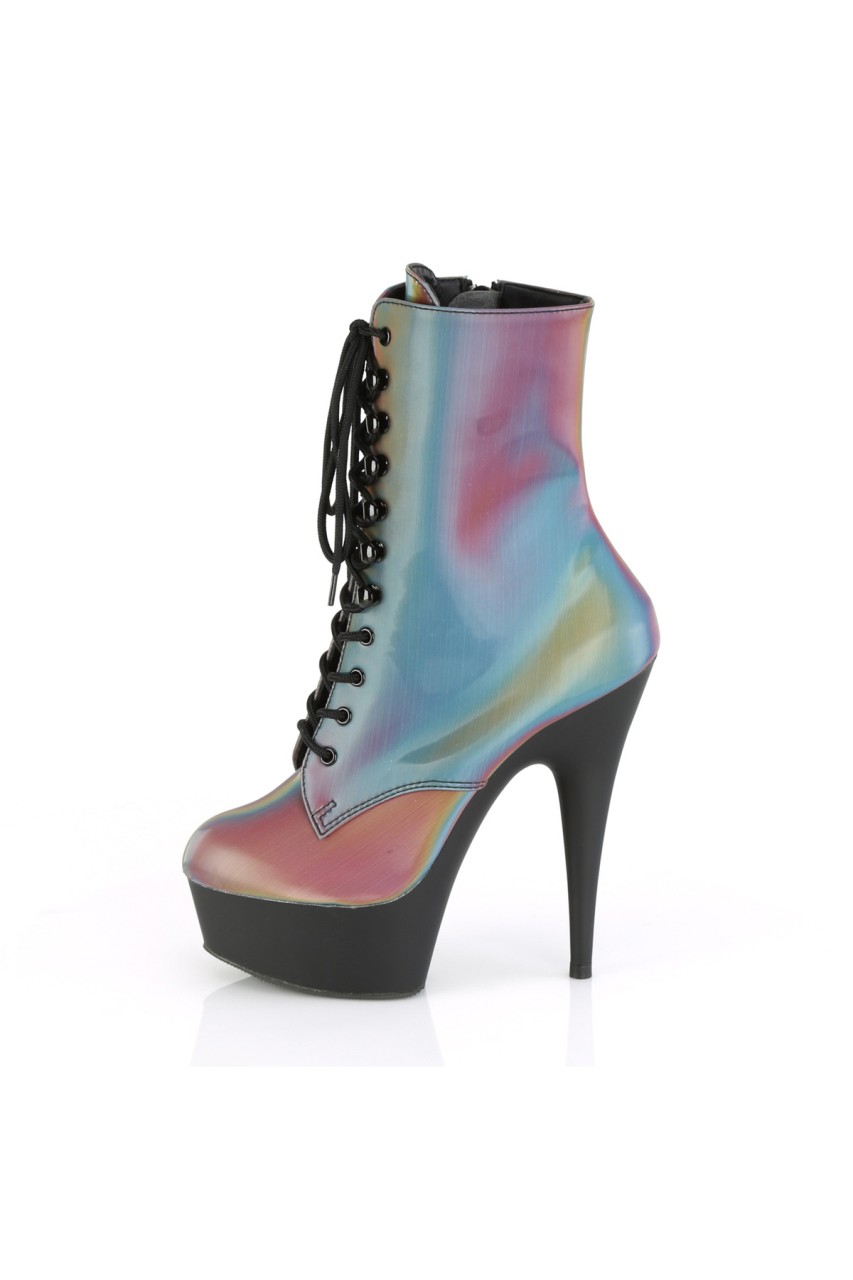 6″” (152mm) Heel, 1 3/4″” (45mm) Platform Lace-Up Front Ankle Boot w/Reflective Rainbow Effect Upper, Inner Side Zip Closure