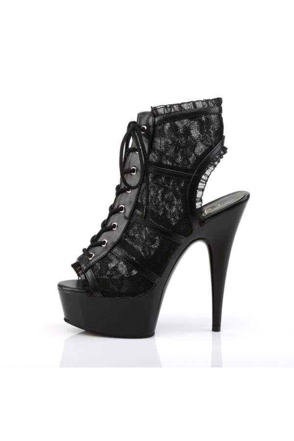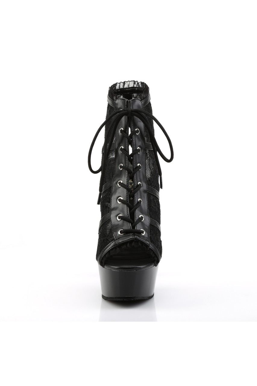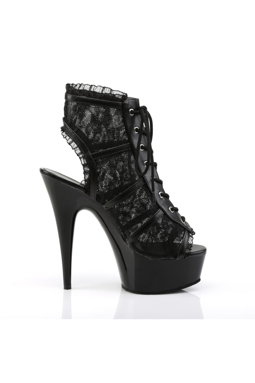 6″” (15.2cm) Stiletto Heel, 1 3/4″” (4.5cm) Platform Lace Up Open Toe Open Back Bootie with Lace Trim Detail