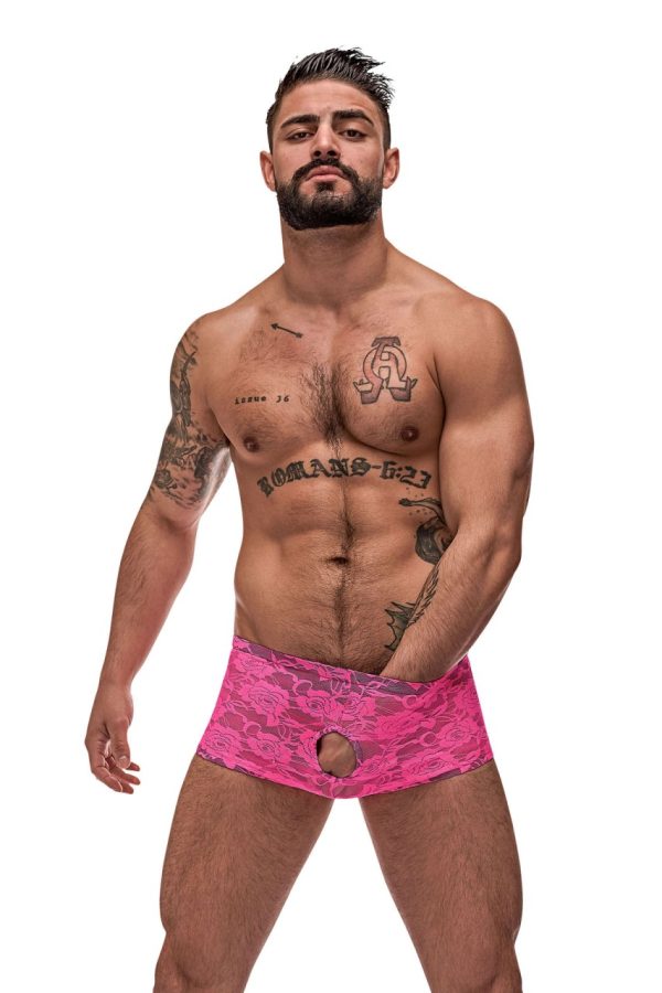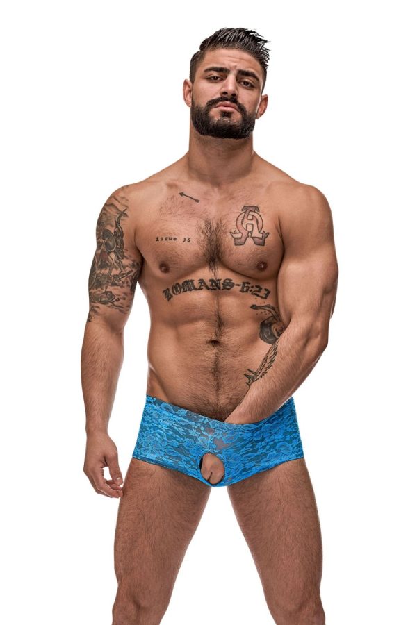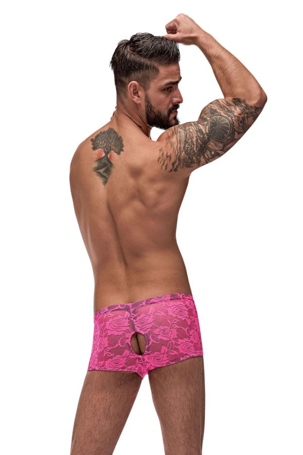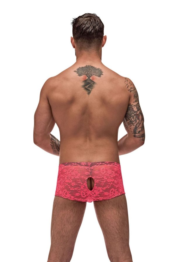 Neon lace crotchless and backless mini short features a low cut wait and high cut legs
