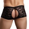 Lace short features crotchless front, peek-a-boo cutout back.85% Nylon 15% Spandex