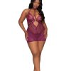 •Contemporary lace and mesh chemise• Adjustable halter neck closure• Center front O-ring detail• Adjustable elastic back straps• Keyhole opening in back• Matching G-string