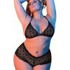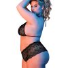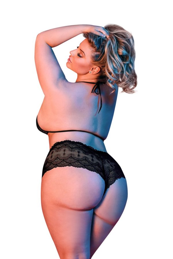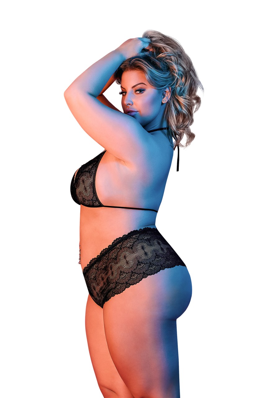 From the Exposed by Magic Silk collection, this style includes: A triangle halter bra featuring soft lace cups, plush ties around the neck and an adjustable back strap with S-hook closure, and a matching high-cut boy short featuring four-way stretch and cheeky back coverage. Soft, black floral lace accented with plush elastic trim. Hand wash, cold. No Bleach. Dry flat. 90% Nylon, 10% Spandex