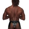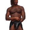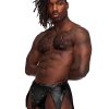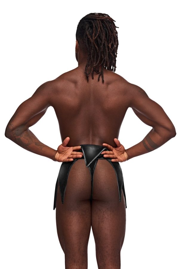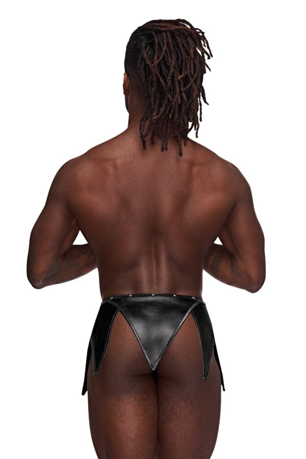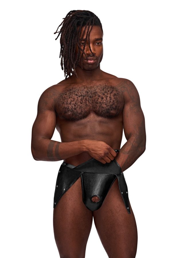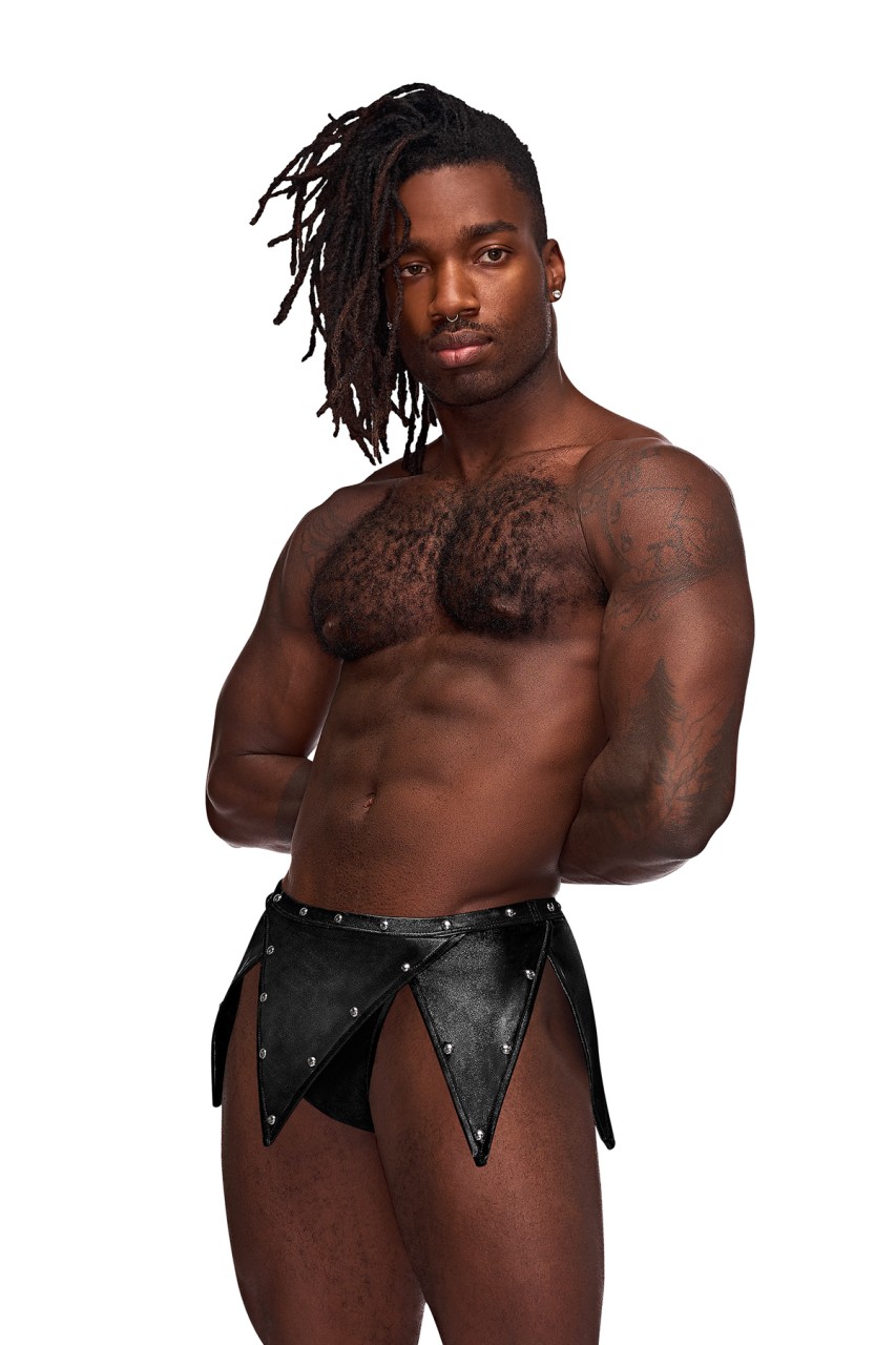 From the Fetish collection by Male Power, this style includes: A gladiator inspired kilt design featuring an attached thong with a cutout peephole, triangle flaps and decorative metal studs. Stretchy jet black four-way stretch leather look fabric adorned with decorative studs Hand Wash Separately, Cold Water, Line Dry, Do Not Bleach