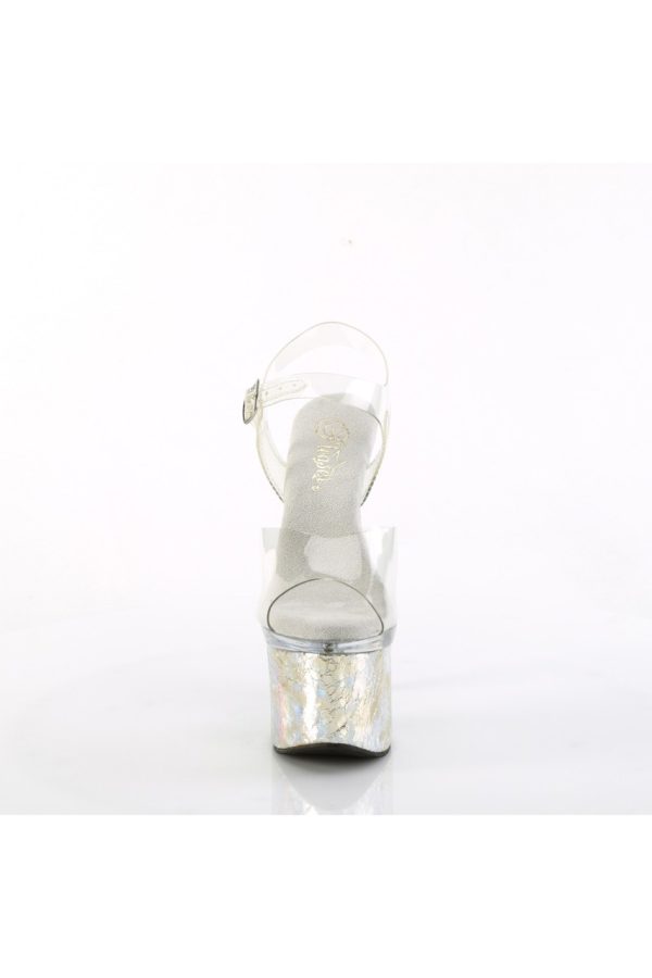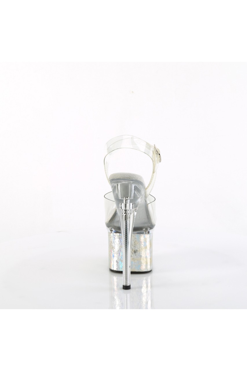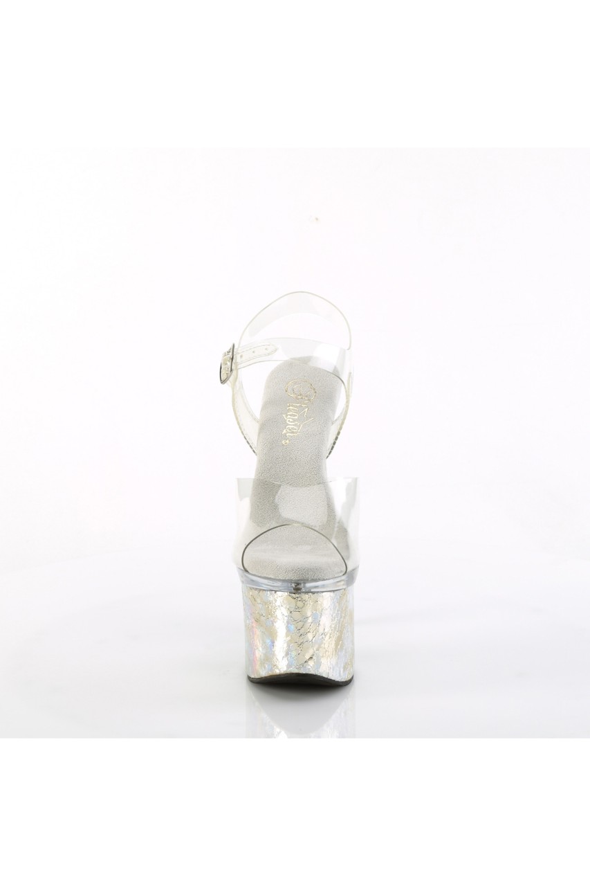 7″” (178mm) Heel, 3″” (76mm) Platform Ankle Strap Sandal Featuring Crackle Hologram Wrapped Lower Platform