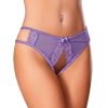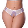 From the Exposed by Magic Silk collection, this style includes: A crotchless low rise mesh panty featuring lace trimming, and a satin bow tie. Sheer stretch mesh fabric paired with delicate scalloped lace trim and soft, silky satin bindings. Hand Wash Cold. No Bleach. Dry Flat. 85% Nylon / 15% Spandex