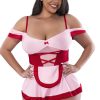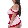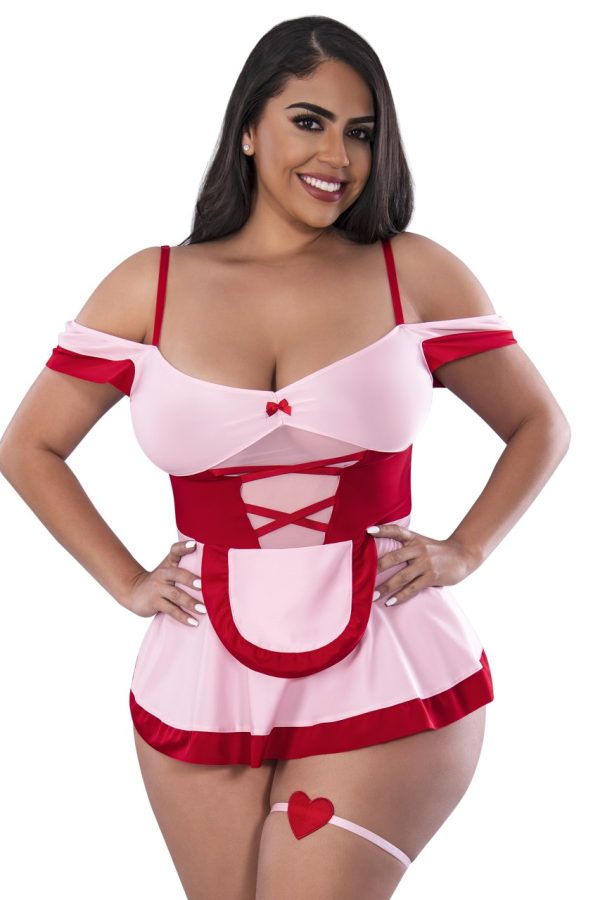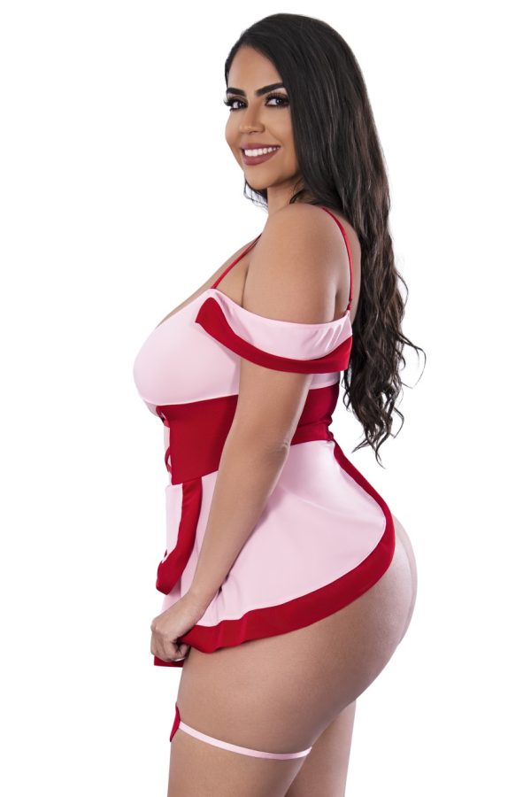 From the Exposed by Magic Silk collection, this style includes: a dress featuring elastic and adjustable shoulder straps with red tone sliders, thick off-shoulder straps, a thigh garter strap with a red heart and a swan hook closure, and a matching g-string. Pink and red soft stretch jersey paired with sheer mesh, faux elastic lacing, and ruffle trim. Hand Wash Cold. No Bleach. Dry Flat. 85% Polyester / 15% Spandex