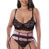 From the Exposed by Magic Silk collection, this style includes: a lace demi bra featuring underwire and hook & eye closure, elastic adjustable shoulder straps with gold tone silders, a satin cincher with attached adjustable garter straps and gold tone sliders, hook & eye closure in the back, and a matching lace and satin thong. Deco-inspired black scalloped stretch lace is paired with a rich mauve silky-soft stretch satin. Hand Wash Cold. No Bleach. Dry Flat. 76% Nylon 24% Spandex