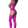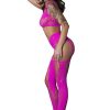 From the Seamless collection by Magic Silk, this style includes: bra with cutouts, halter neck and sleeves, garter stocking with cutouts, and G-string. All are adorned with rhinestones. This stretchy style can conform to any body type and is extremely flattering! This garment is blacklight reactive.