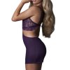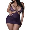 From the Leather & Lace collection by Magic Silk, this style includes: a lace cup chemise with front cutouts, a gold ring, an open back with swan hook closure, adjustable gold sliders, and a wet look thong with picot elastic trim.