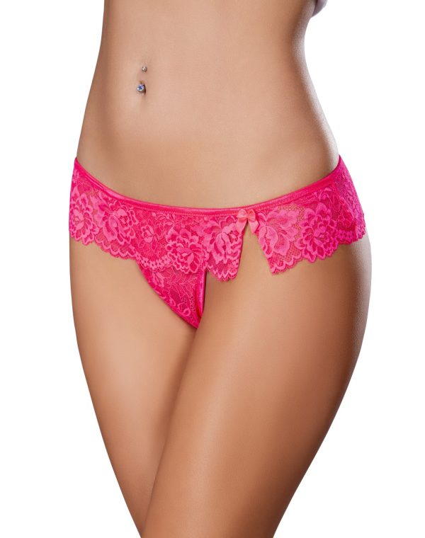 From the Exposed by Magic Silk collection, this style includes: A stretchy lace thong featuring attached flowy scalloped lace at the hips and a satin bow. Stretch lace galloons placed to maximize the flirty scalloped edges, finished with soft, shiny elastic strap details, blacklight reactive. Hand Wash Cold. No Bleach. Dry Flat. 90% Nylon / 10% Spandex