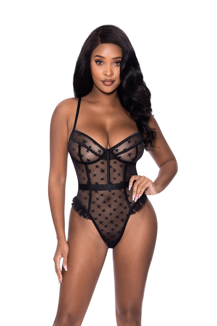 From the Exposed by Magic Silk collection, this style includes: a teddy featuring star designs, elastic adjustable shoulder straps with black tone sliders, hook and eye closure in the back, an open cut-out in the back, boning in the front, a high cut design in the hips with ruffle details, and a snap crotch. Shooting stars in playful designs and stretchy black mesh. Hand Wash Cold. No Bleach. Dry Flat. 85% Nylon, 15% Spandex