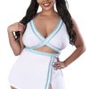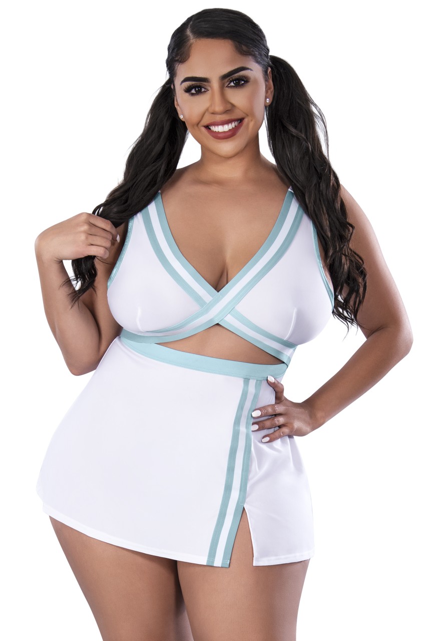 From the Exposed by Magic Silk collection, this style includes: a sporty dress featuring a cross front, elastic straps in the back, and a matching g-string. Lt. blue and white soft stretch jersey paired with white lace and blue/white striped elastic. Hand Wash Cold. No Bleach. Dry Flat.