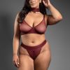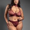 Embossed faux leather and sheer mesh convertible halter bra with detachable chain leash and matching open panty; gold hardware