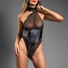 Sheer mesh teddy with zipper halter, faux leather corset bodice and front to back zipper bottom; gold hardware