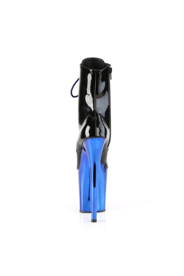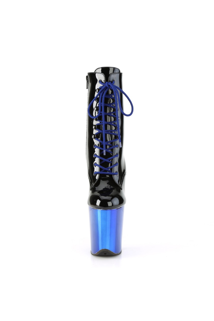 8″” (200mm) Heel, 4″” (100mm) Platform Lace-Up Front Ankle Boot Featuring Chrome Plated Platform Bottom, Inner Side Zip Closure