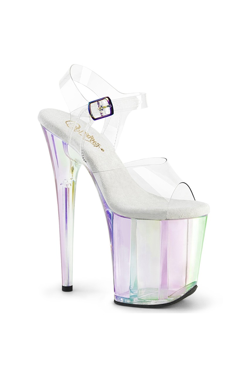 8″” (200mm) Heel, 4″” (100mm) Platform Ankle Strap Sandal Featuring Holographic Tinted Platform Bottom
