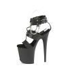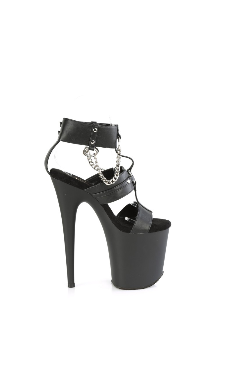 8″” (200mm) Heel, 4″” (100mm) Platform Triple Band T-Strap Dual Ankle Buckled Sandal W/Metal O-Rings, Studs & Chains Detail
