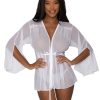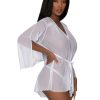 From the Exposed by Magic Silk collection, this style includes: a thigh length robe featuring breathable mesh, lace across the shoulders, flowy bell style full-length side slit sleeves, a ruched accent in the back, and an attached silky ribbon tie waist. Breathable mesh in midnight black paired with lovely lace and silky ribbon. Hand Wash Cold. No Bleach. Dry Flat. 90% Nylon, 10% Spandex