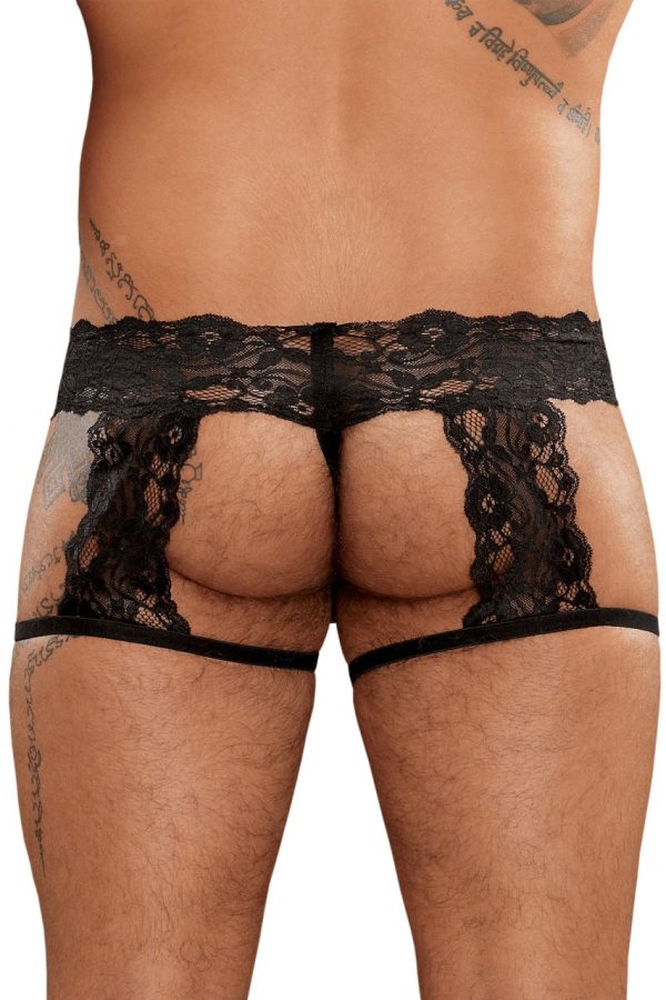 Lace garter short features mesh pouch with cire trim, thick floral lace waistband with matching garters attached to plush elastic leg holes and g-string back.